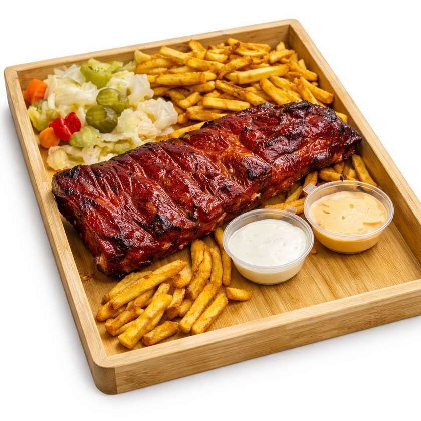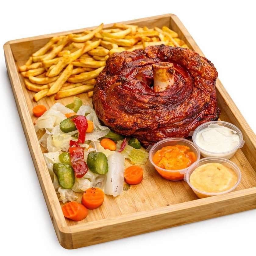 Ciolan la rotisor, cartofi prăjiți, murături asortate, ardei copt, 3x sosuri (1.52kg).