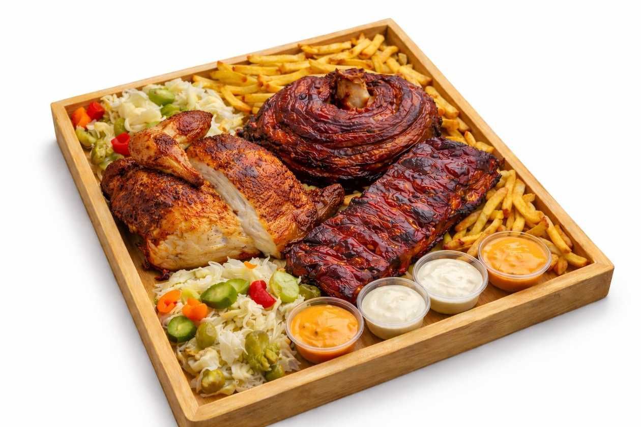 1/2 pui, scăriță, ciolan Doleanu, cartofi prăjiți, murături asortate, ardei copt, 4x sosuri (2,67kg).