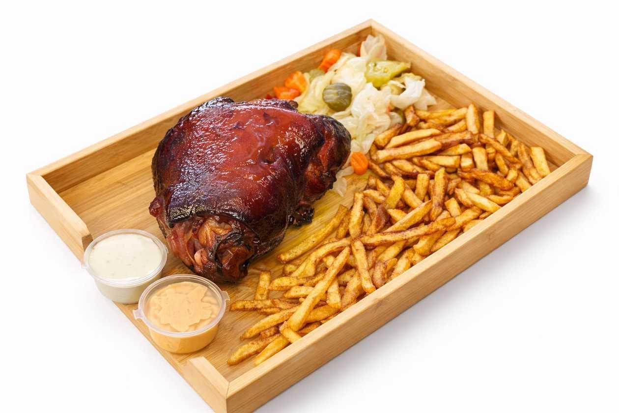 Ciolan mare de porc, rotisat lent până la crustă crocantă și miez fraged. Gust intens, carne suculentă și șorici rumenit perfect – produsul emblematic Doleanu.