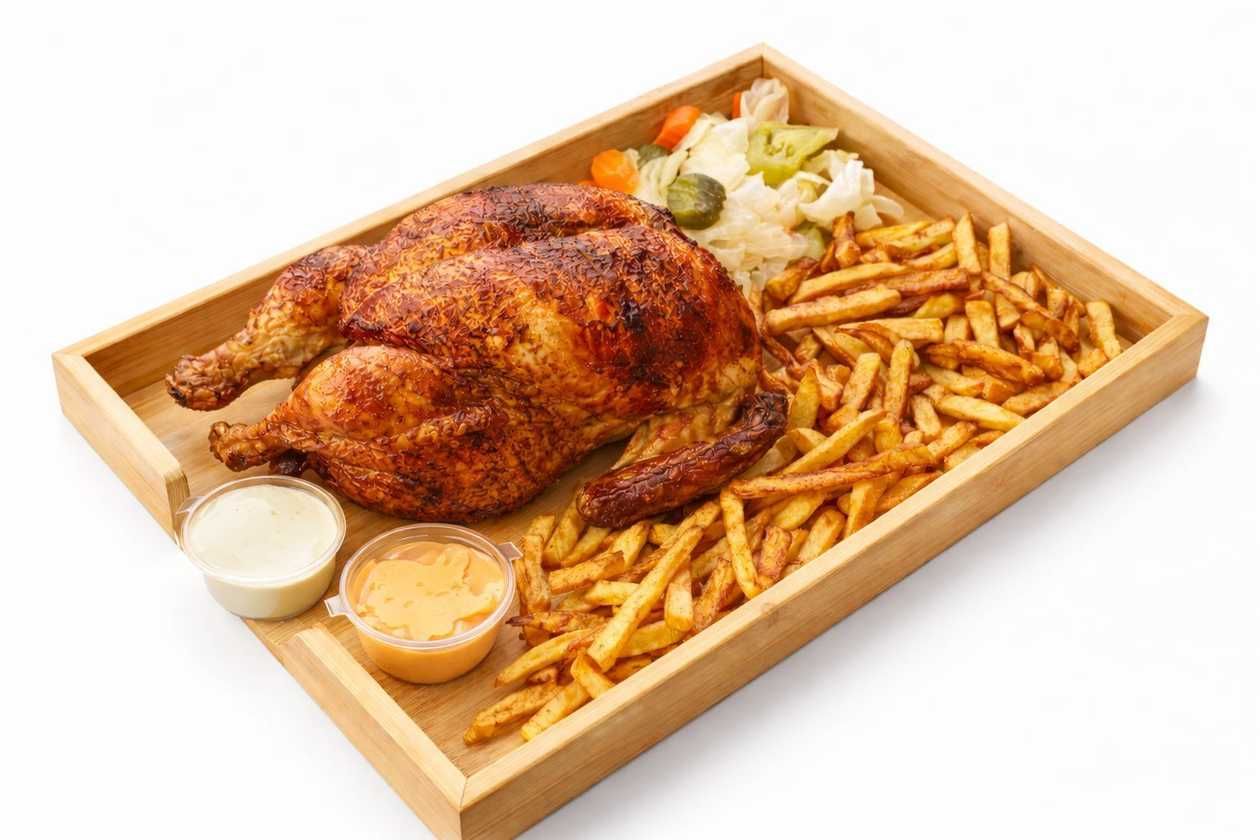 Pui întreg la rotisor, rumenit uniform, cu piele crocantă și carne fragedă, suculentă. Preparat lent pentru gust intens și textură perfectă, ideal pentru o masă.